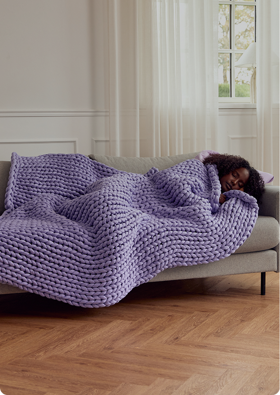 Knitted weighted blanket made from ultra-soft, upcycled fabric.