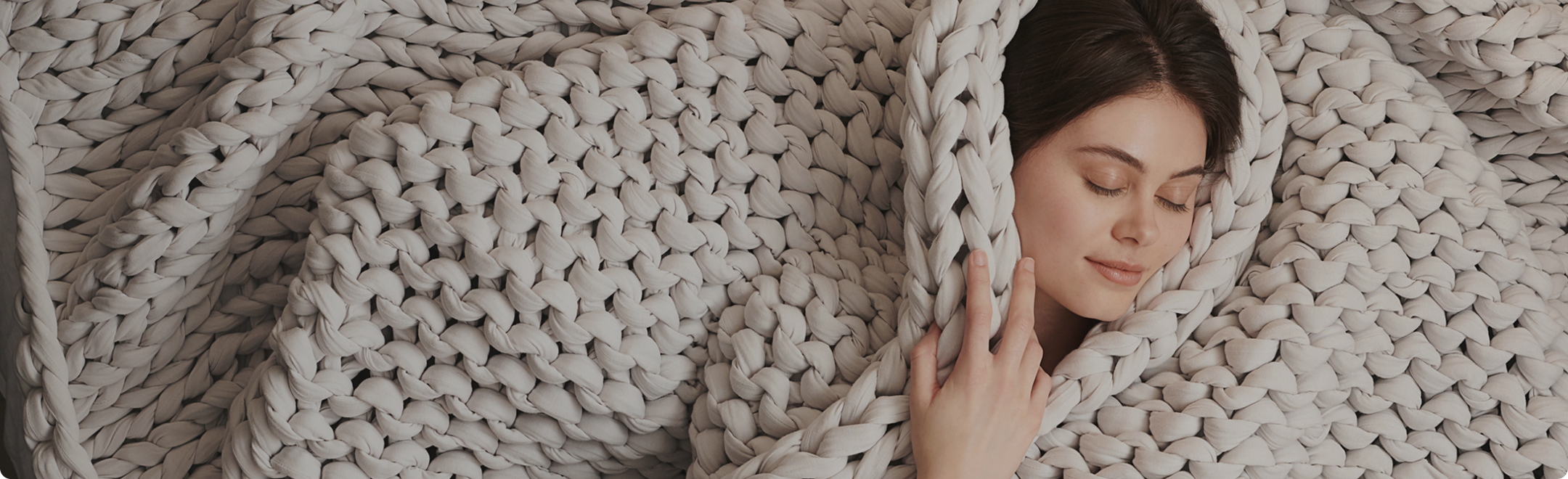 Our weighted blankets get their weight only from soft, sustainable fabric, which is hand-knitted to create evenly dispersed weight across your full body. The weight on your body stimulates the production of serotonin (the happy hormone), reduces cortisol (the stress hormone), and increases melatonin, helping you fall (and stay) asleep naturally.